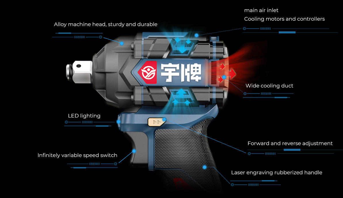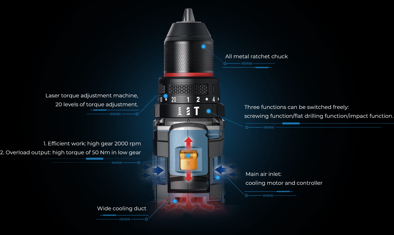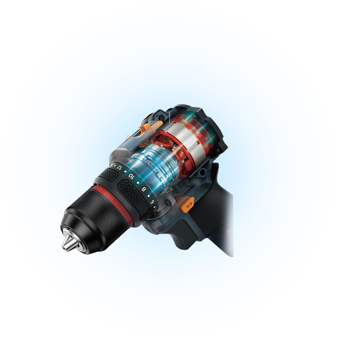Bezkomutátorový vysokootáčkový motor generuje méně tepla a je vhodnější pro dlouhodobé nepřetržité používání. Výkon se při stejném objemu zvýší o 20 % a točivý moment o 30 %. Má nízké ztráty, dobrý odvod tepla a není snadné jej demagnetizovat. Za stejných pracovních podmínek se životnost motoru prodlouží 3krát. , vysoká účinnost motoru a životnost jedné baterie se zvýšila o 20 %.